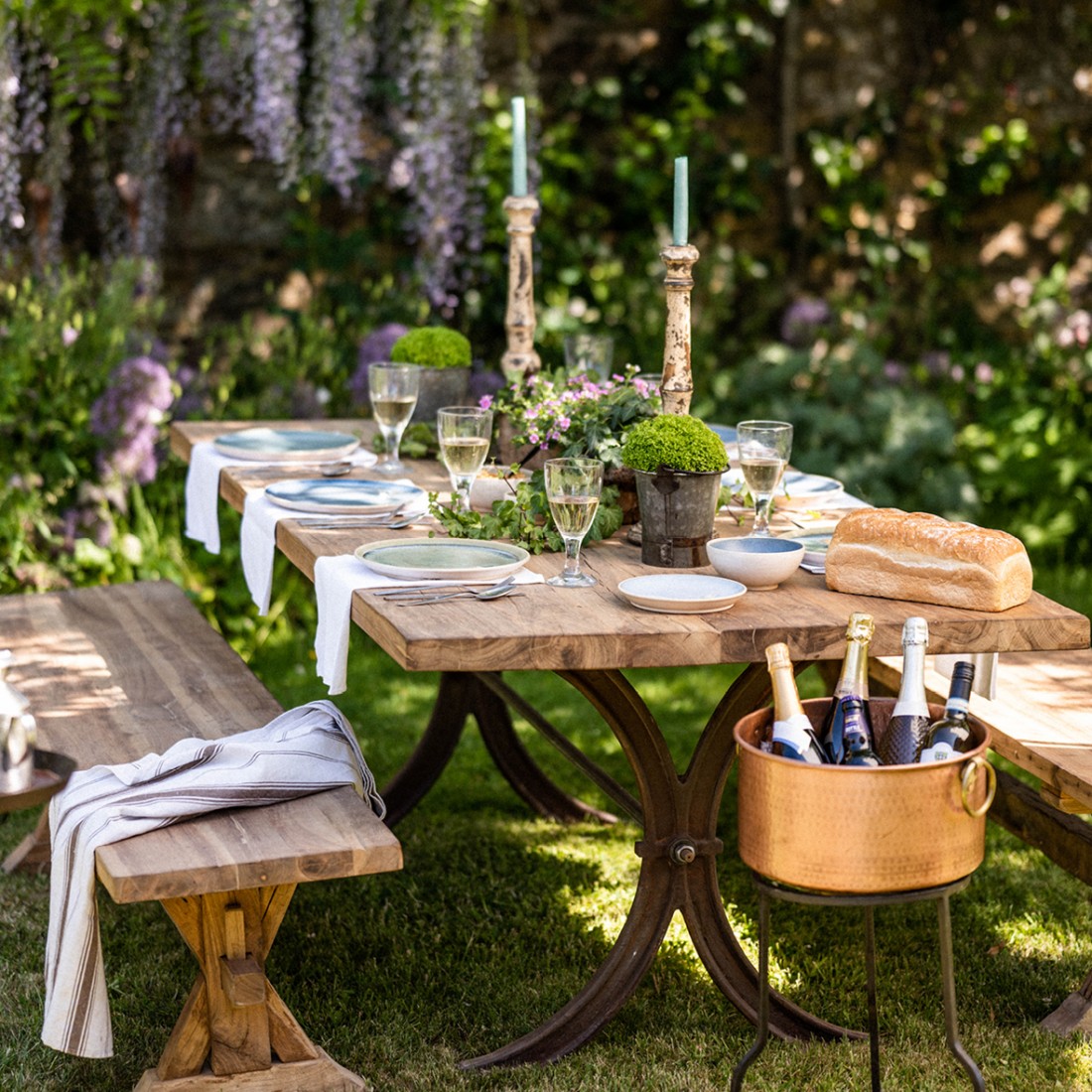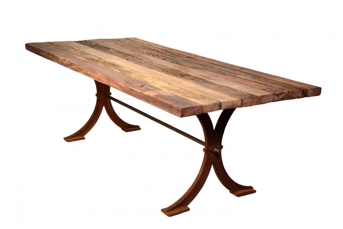 A substantial Reclaimed Teak Table made from old Rajasthan beams and fitted onto a graceful cast iron base. The external face of the beams has been kept to create this wonderfully rustic surface. Please contact our Customer Services team to discuss this product if required for outdoor use.