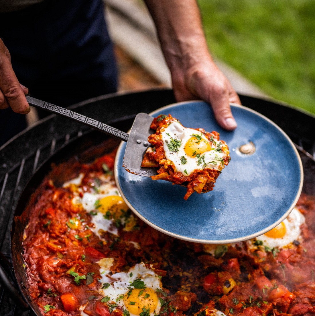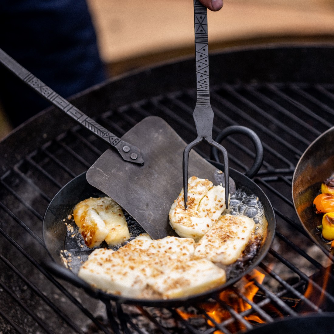 This handmade BBQ Utensil set will add style and functionality to your next Kadai BBQ. The set comes in its own cotton carrier and includes a spoon, spatula, and fork, all hand-forged in durable mild steel. Also included is a unique frame that neatly fits onto the rim of a Kadai Fire Pit, keeping the Utensil handles away from the heat and always ready for use. Every BBQ Utensil has an elegant design engraved individually.