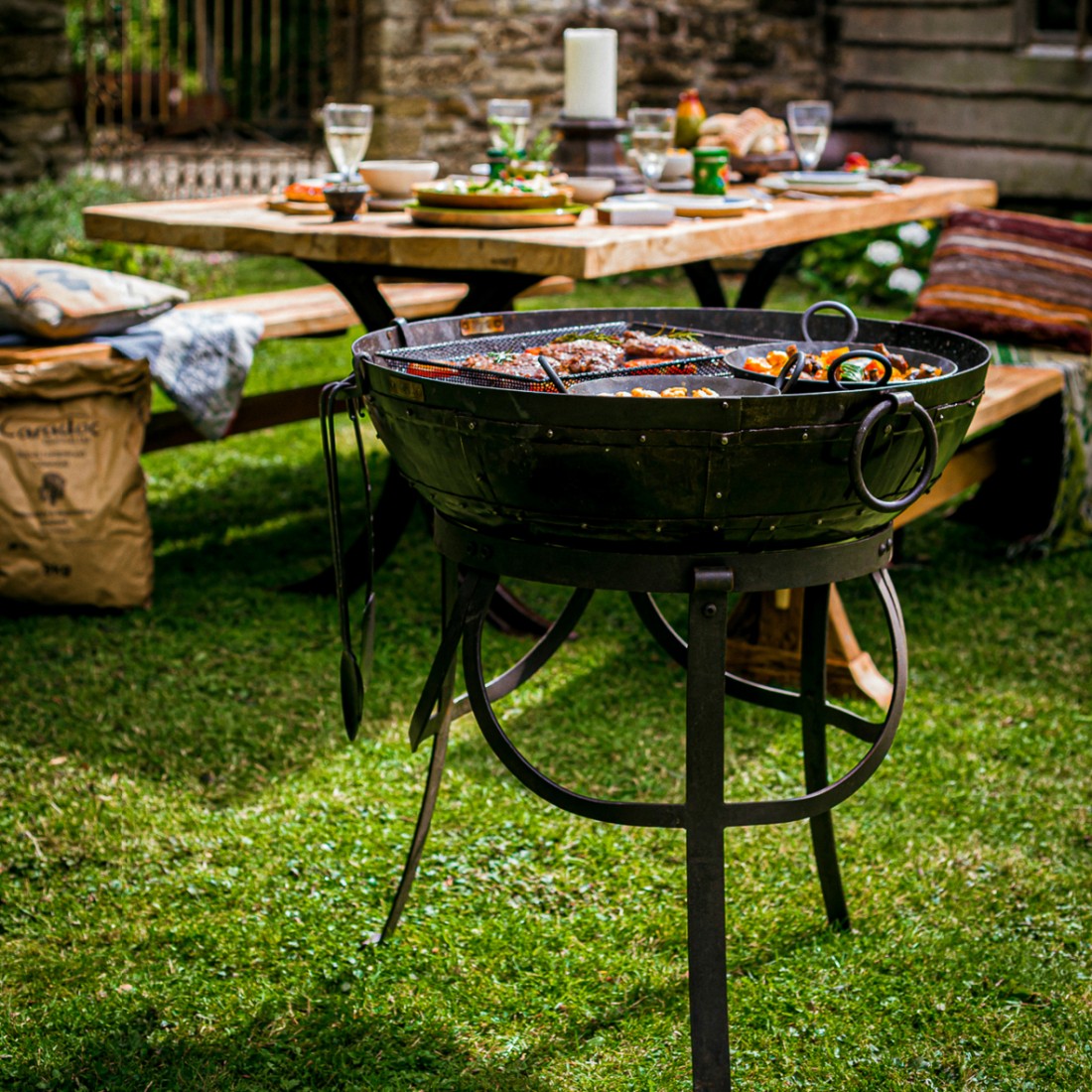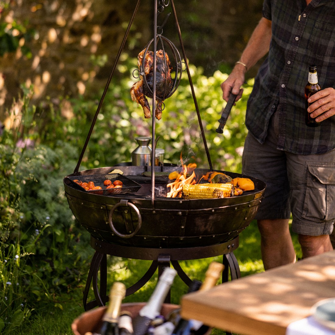 Handmade in India by skilled artisans, this charcoal BBQ made from recycled oil drums, combines beauty with functionality. This product comes with a Gothic High Stand, the perfect height for your next charcoal BBQ. Each piece is meticulously crafted with hand-cut metal plates riveted in the traditional way for unmatched strength and durability. Featuring the same drop handles as the Original Kadai Fire Bowls, these charcoal BBQs boast authenticity and quality. The Holi Grill has a removable centre part for refuelling or directly cooking in the hot embers.