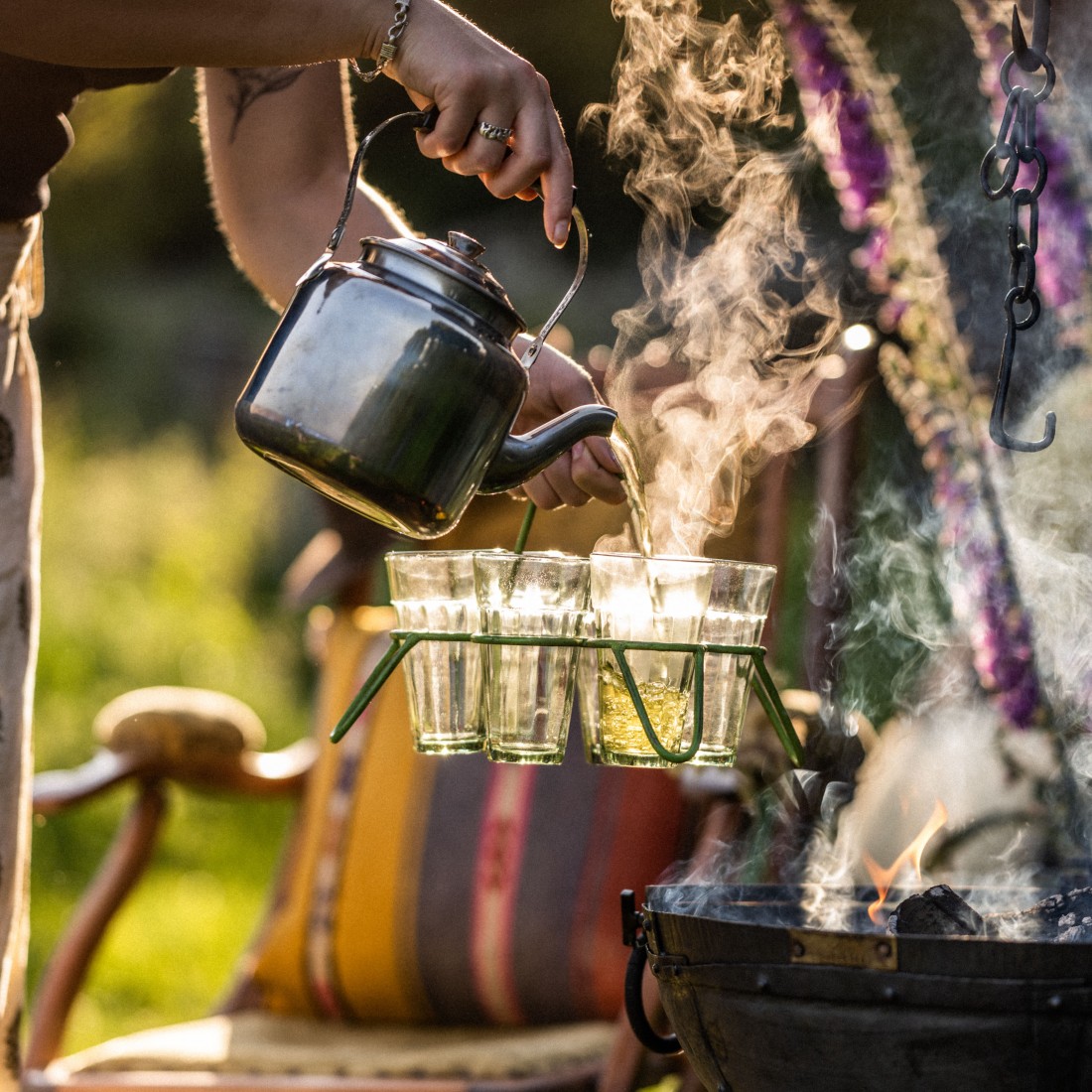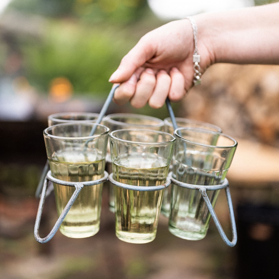 A traditional Indian Set of 6 Chai Glasses in a Painted Metal Carry Frame. This is perfect for carrying drinks out to the garden.
