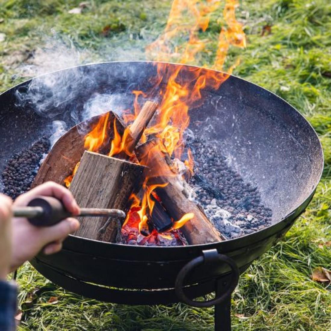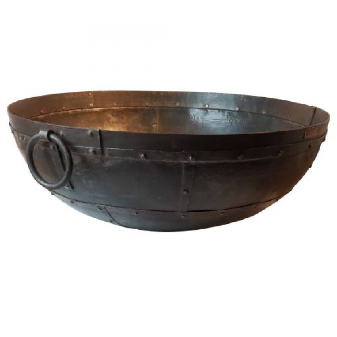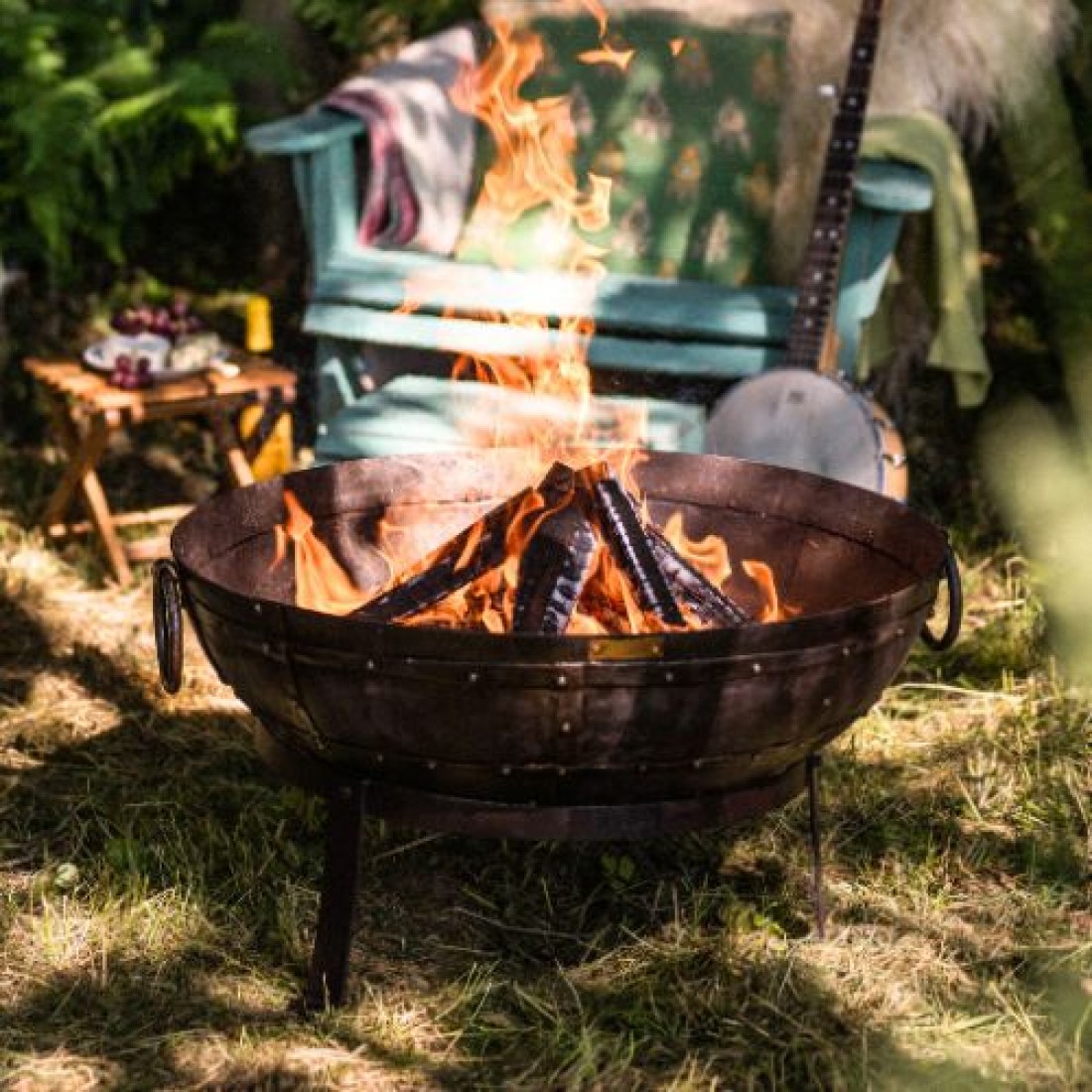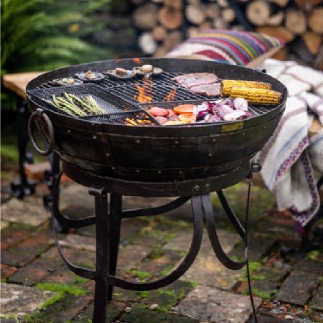 Handmade in India by family workshops, this Kadai Fire Bowl is crafted from recycled oil drums, combining beauty with functionality. Each bowl is meticulously formed from hand-cut metal plates, riveted in the traditional way for exceptional strength and durability. With the same distinctive drop handles as the Original Kadai Fire Bowls, it exudes authenticity and quality. The bowl is sold on its own, including only the Kadai beads, but remains compatible with the Gothic High Stand, Low Stand, and Holi Grill, making it a versatile addition to any outdoor space for both grilling and gathering around the fire.