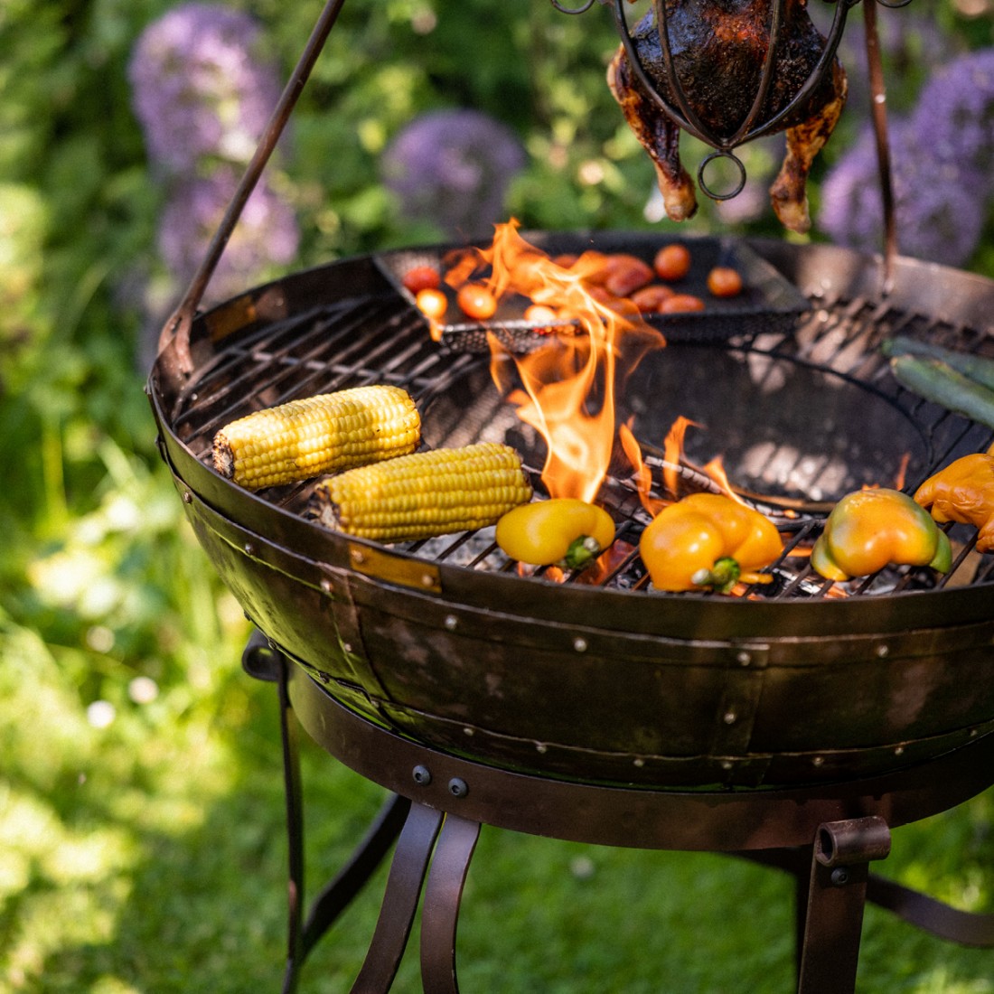 Handmade in India by skilled artisans, this charcoal BBQ made from recycled oil drums, combines beauty with functionality. This product comes with a Gothic High Stand, the perfect height for your next charcoal BBQ. Each piece is meticulously crafted with hand-cut metal plates riveted in the traditional way for unmatched strength and durability. Featuring the same drop handles as the Original Kadai Fire Bowls, these charcoal BBQs boast authenticity and quality. The Holi Grill has a removable centre part for refuelling or directly cooking in the hot embers.