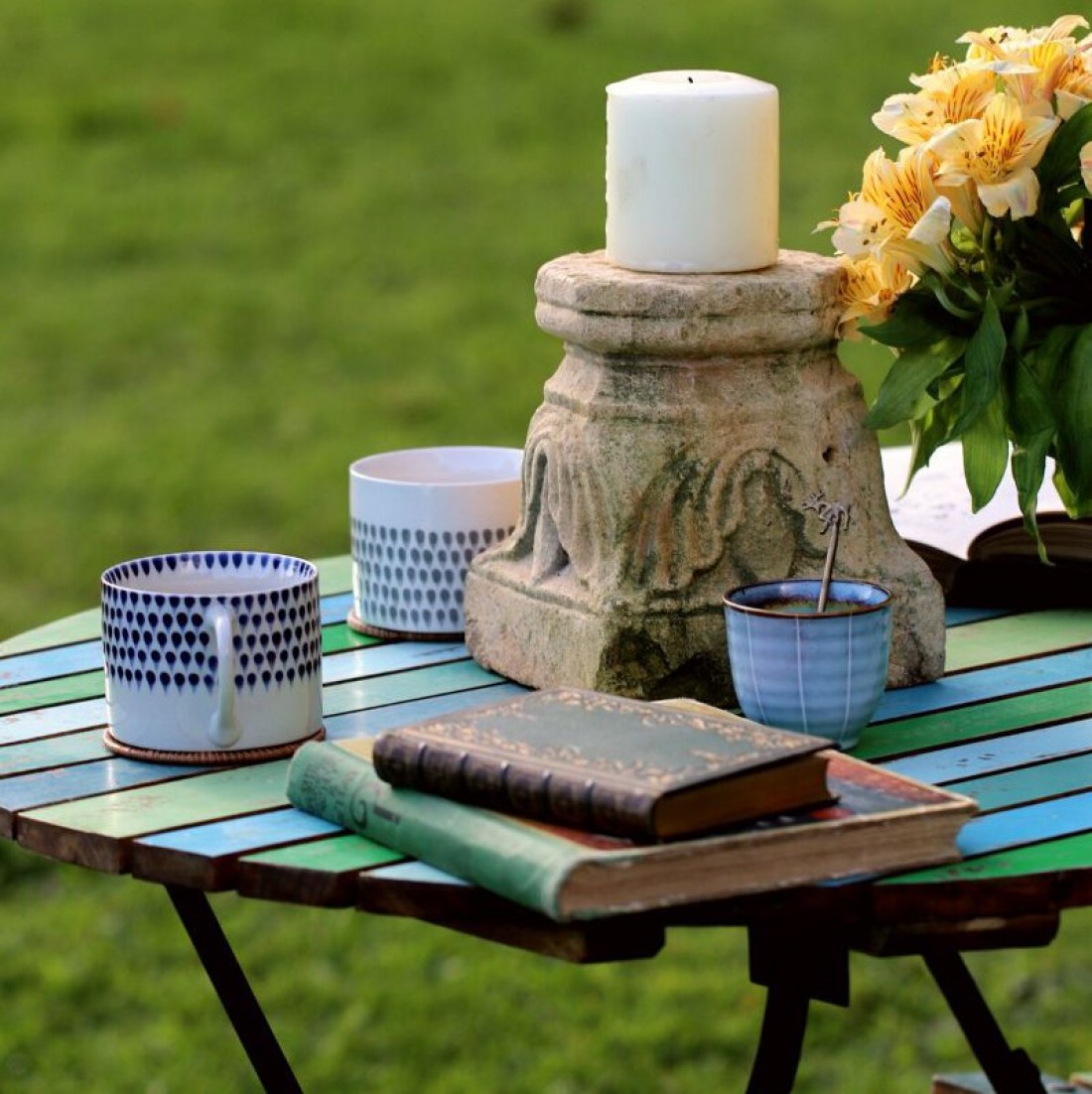 An attractive table with a reclaimed hardwood top and sturdy metal base that folds flat for storage. Handpainted with our classic green, blue and teal, to add some colour to outdoor space. Matching Folding Chairs also available.