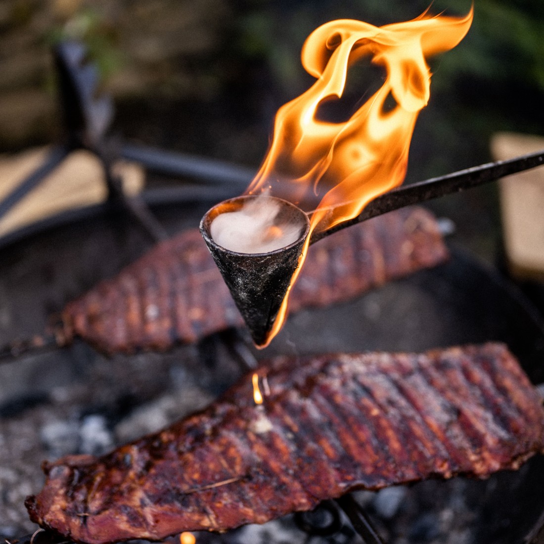 The Flambadou is not your everyday accessory but definitely one to impress. Place directly in the hot coals and leave to get red hot. Remove from the fire, taking care, place a large piece of fat or butter directly into the cone and use for basting directly onto the meat or fish - A grand finale to your cooking. The hand-forged leaf design acts as a comfortable handle to control the Flambadou.